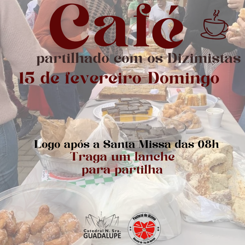 No próximo dia 15 de fevereiro, após a Missa das 08h, teremos o tradicional Café do Dizimista na Catedral Nossa Senhora de Guadalupe.
