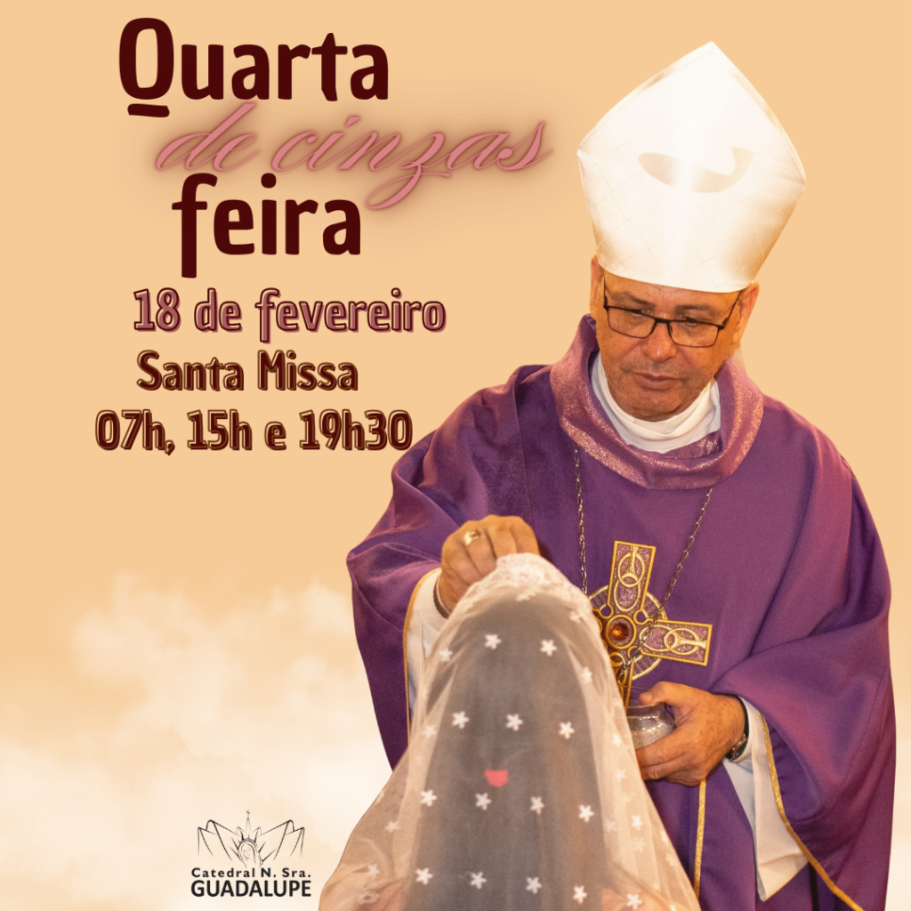 As celebrações da Quarta-feira de Cinzas, dia 18 de fevereiro, serão realizadas às 07h,15h e 19h30 (celebração presidida pelo Bispo Diocesano Dom Sergio de Deus Borges).